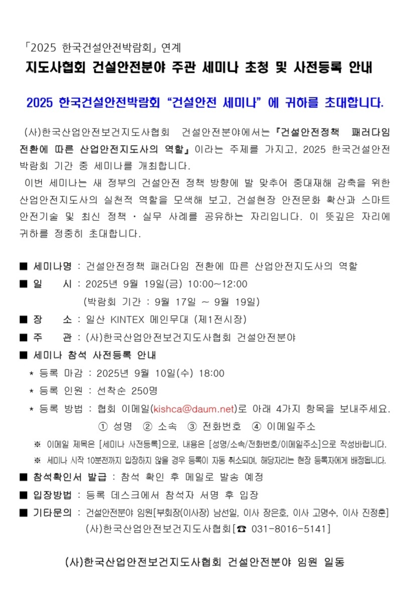 「2025 한국건설안전박람회」연계 _ 지도사협회 건설안전분야 주관 세미나 초청 및 사전등록 안내