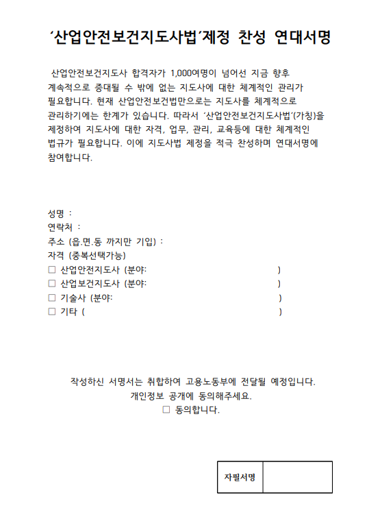 협회에서 산업안전보건지도사법 제정과 관련하여 연대서명을 진행하려고 합니다.