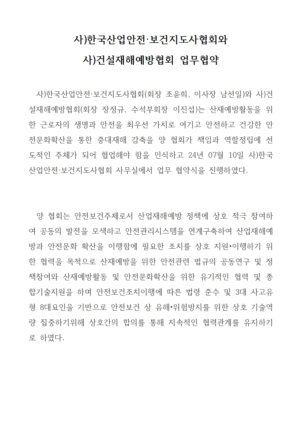 (사)건설재해예방협회와 안전문화확산 및 산재예방활동을 위한 업무협약