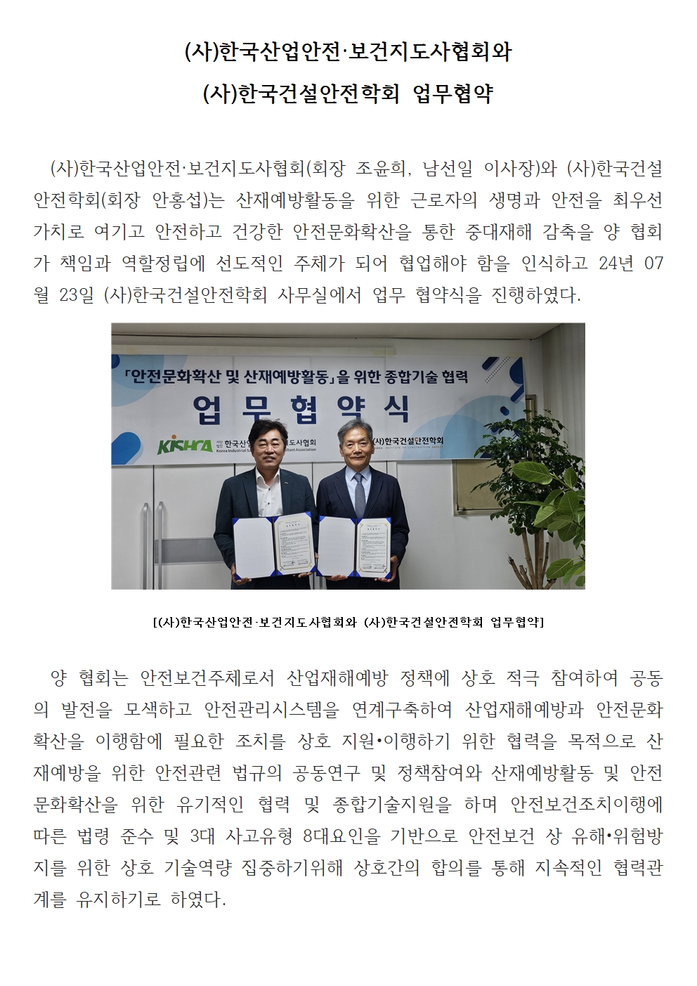 (사)한국산업안전·보건지도사협회와 (사)한국건설안전학회 업무협약