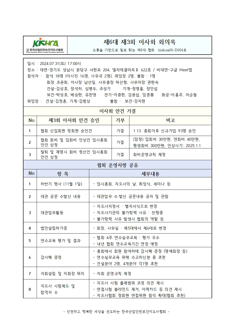 등의 내용이 있으며 이외에도 협회 정회원이 아닌 분들도 아실 필요가 있는 내용이 다수 있어 제3회 이사회 회의록을 공개합니다.