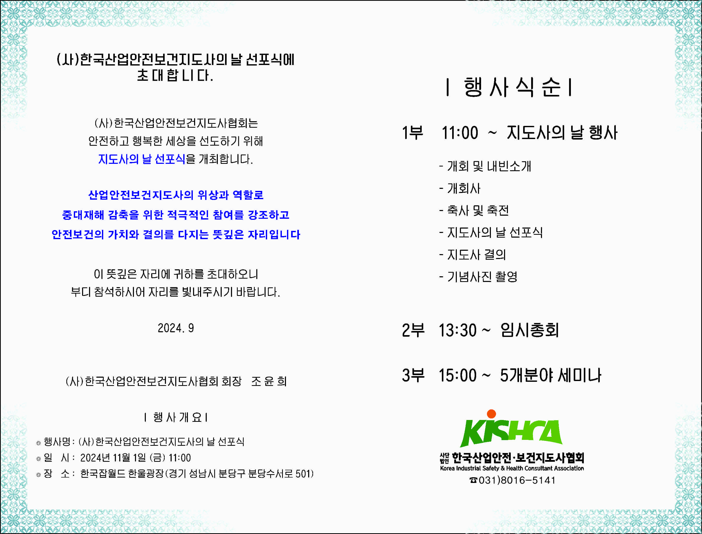 [(사)한국산업안전보건지도사의날 선포식 / 임시총회 / 세미나 개최]