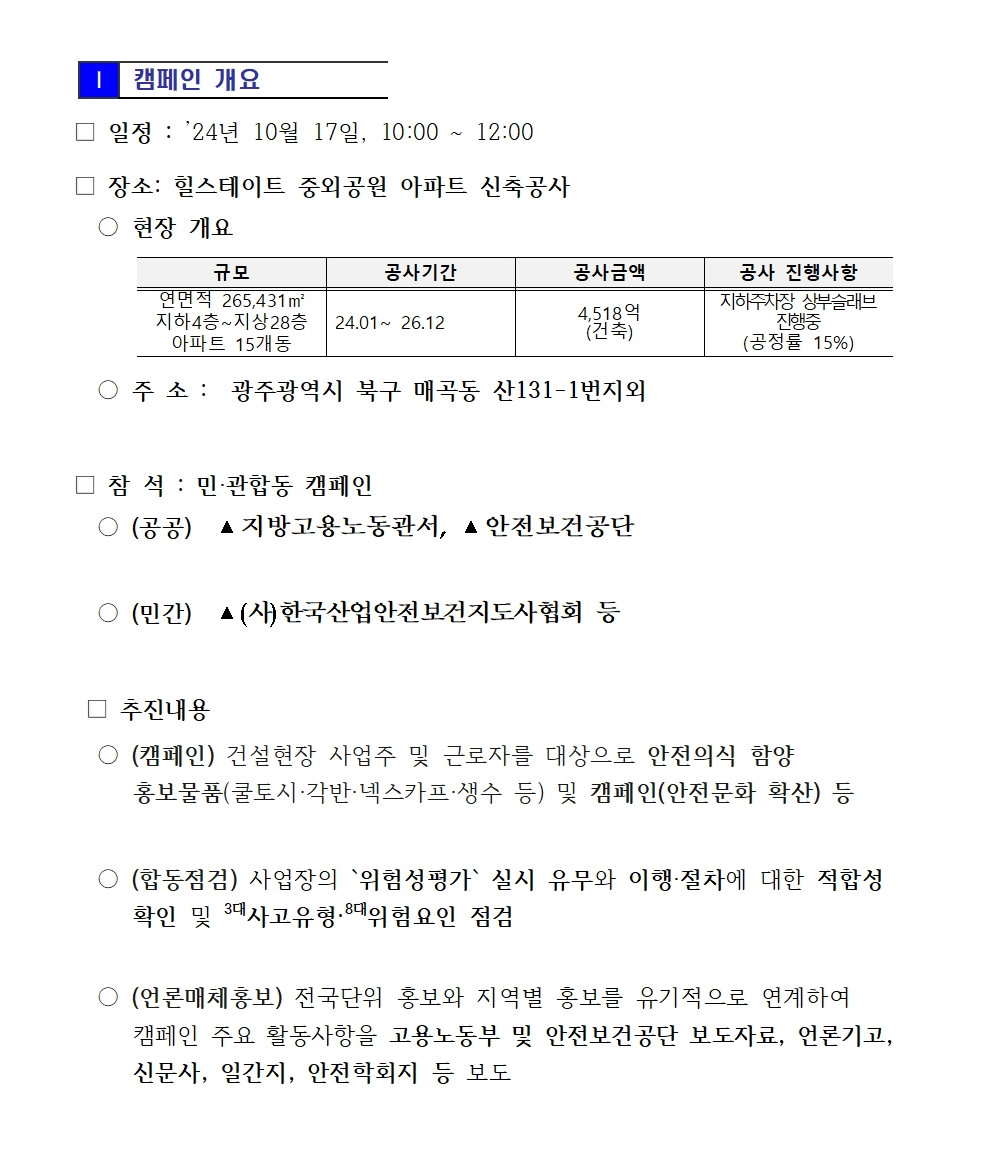 10월17일 협회 주관으로 “중소규모 건설현장 중대재해예방 실천 캠페인”을 광주에서 실시합니다.