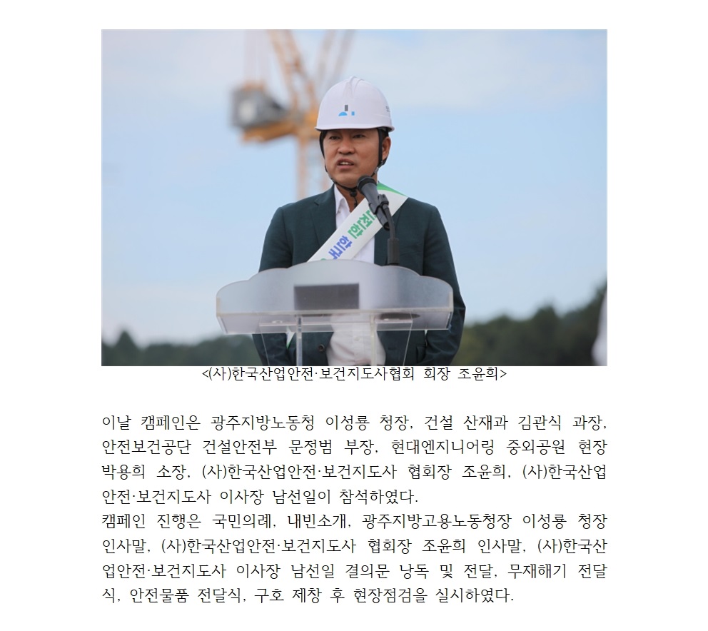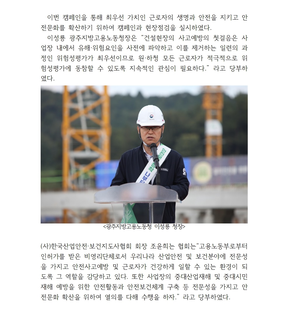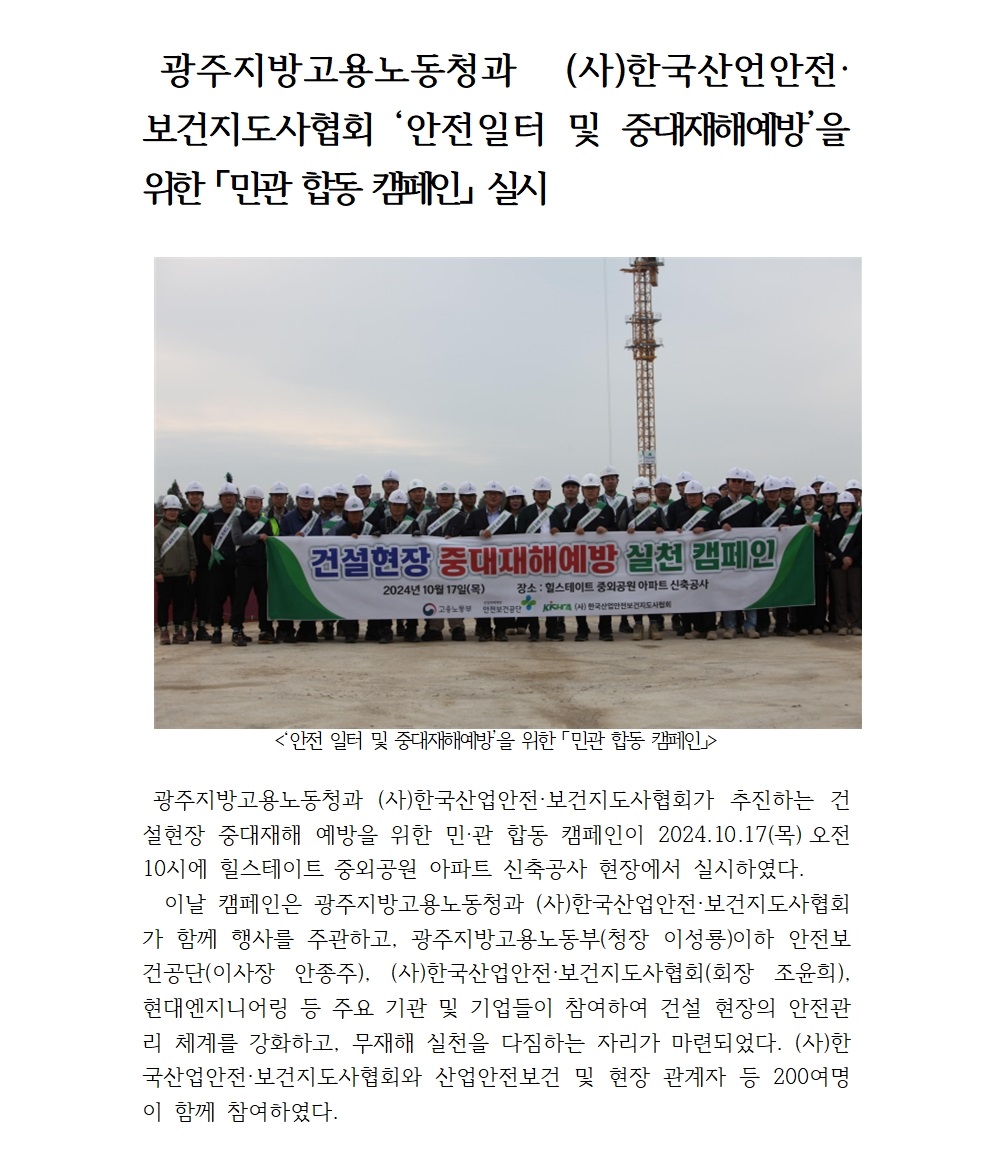광주지방고용노동청과 (사)한국산언안전·보건지도사협회 ‘안전일터 및 중대재해예방’을 위한 「민관 합동 캠페인」 실시 < 안전 < 건설 < 기사본문 - 시사뱅크 (sisabank.com)