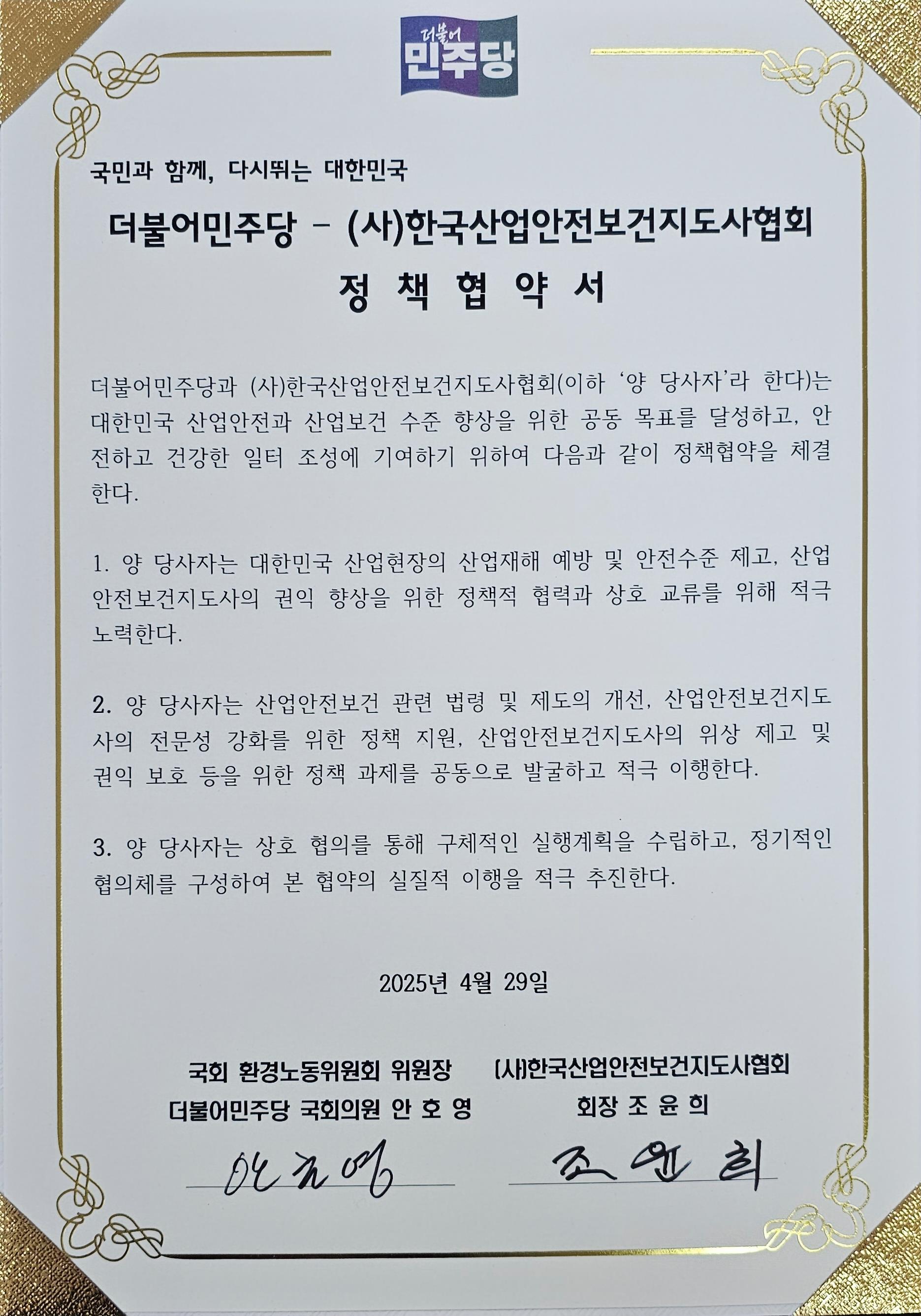 「더불어민주당 – (사)한국산업안전보건지도사협회 정책협약식」을 체결하였습니다.