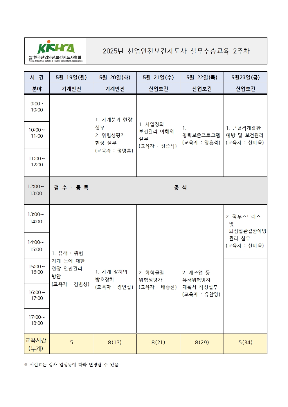 한국산업안전진단보건지도사협회 주관으로 5월 12일부터 5월 30일까지 집체교육,