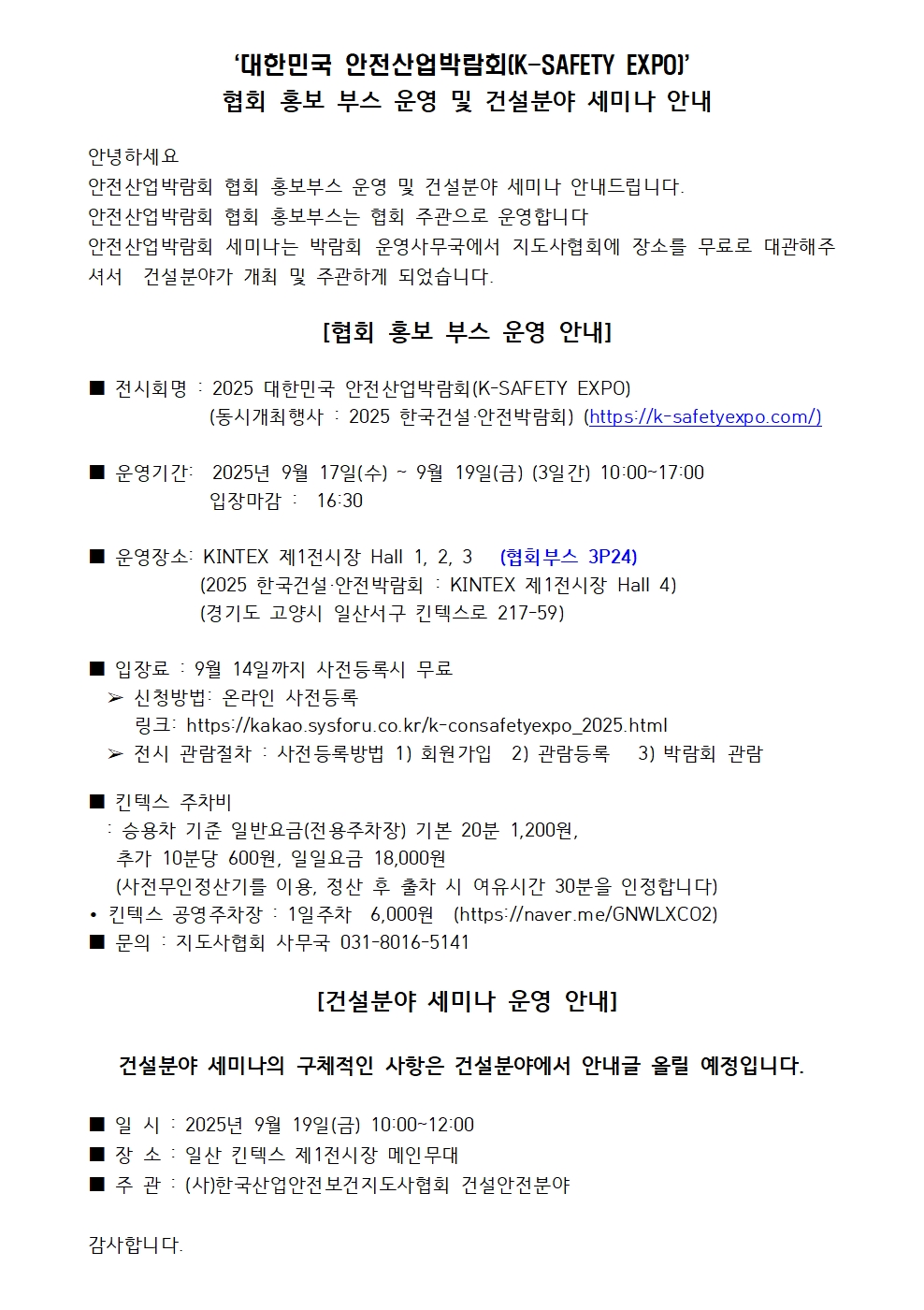 안전산업박람회 협회 홍보부스 운영 및 건설분야 세미나 안내드립니다.